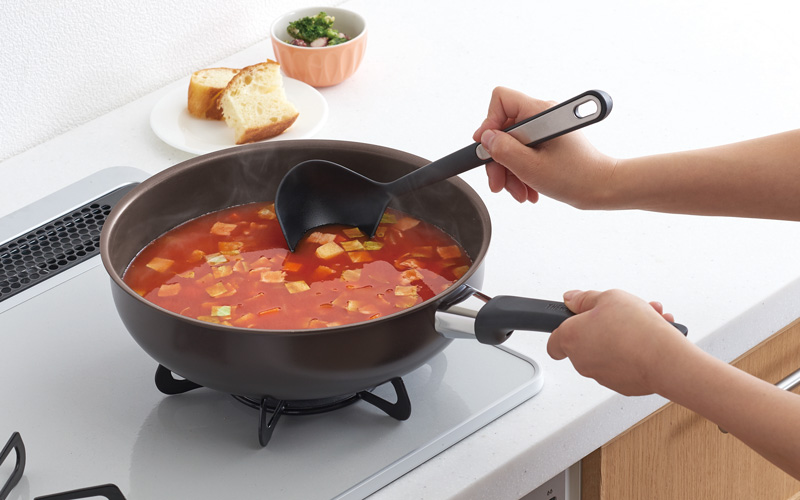 汁気の多い重めな調理を想定し、どの位置でもしっかりと握り込めるグリップ形状にしました。