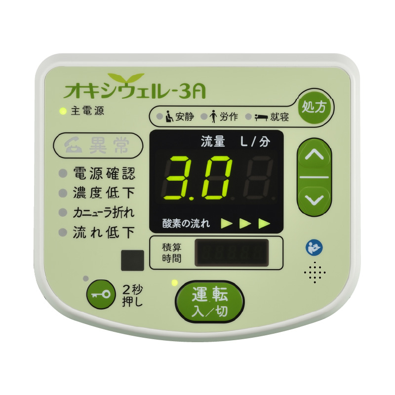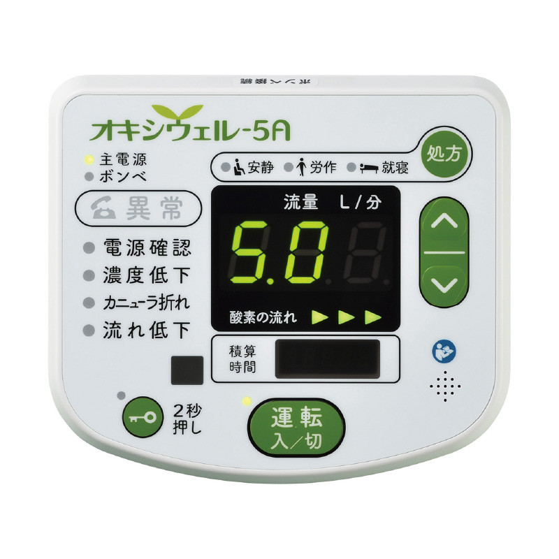 Graphic Usability オキシウェル-5B+ / 5A+ / 3A操作パネル 大陽日酸株式会社 慢性呼吸不全や肺高血圧症、慢性心不全の患者さんが、家庭で酸素吸入を行う在宅酸素療法に使用される酸素濃縮装置の操作パネルをデザインしました。
